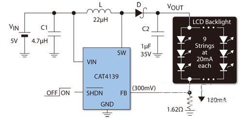 首先計算處理2W的負載需要多大的開關電流。假定效率為80%,輸入電流等于Vout×Iout/Vin×效率=10×0.18/5×0.8=450mA。CAT4139電感型升壓LED驅動器具有750mA(最小值)的驅動能力,故很適合于該應用。