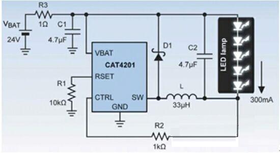 圖2:使用CAT4201驅動5個1W的LED。