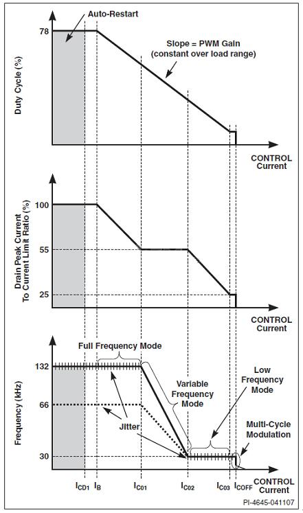 隨著電源負(fù)載進(jìn)一步降低和開(kāi)關(guān)頻率達(dá)到30kHz,TOPSwitch-HX將切換至固定低頻PWM模式。在此模式下,通過(guò)調(diào)整MOSFET導(dǎo)通時(shí)間,可使開(kāi)關(guān)頻率保持在音頻波段以上并維持輸出穩(wěn)壓。開(kāi)關(guān)頻率保持恒定不變且占空比減小,工作方式與全頻PWM模式相同,都通過(guò)縮短MOSFET導(dǎo)通時(shí)間來(lái)實(shí)現(xiàn)。峰值漏極電流從初始的最大值下降到最小值,即設(shè)定流限值的25%,這樣可以在低功率時(shí)保持高效率,避免音頻噪聲問(wèn)題。