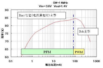 DC-DC轉(zhuǎn)換器的電源轉(zhuǎn)換效率和功率電感性能之間的關(guān)聯(lián)如圖3所示。PFM是指手機(jī)在待機(jī)狀態(tài)下保持低電流負(fù)荷的模式,這時(shí)電源轉(zhuǎn)換效率性能是與功率電感的Rac (交流電阻) 以及電流-感值偏執(zhí)特性相關(guān)。圖4當(dāng)中顯示了各功率電感的Rac特性以及圖5中開關(guān)頻率數(shù)是4MHz的DC-DC轉(zhuǎn)換器IC的電源轉(zhuǎn)換效率特性。