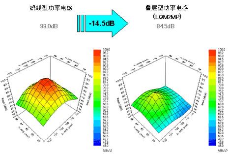 圖6顯示了繞線型功率電感和疊層型功率電感的磁束泄漏監(jiān)測數(shù)據(jù)。與一直以來作為DC-DC轉(zhuǎn)換器上使用的主要功率電感的繞線型功率電感相比,疊層型功率電感的磁束泄漏更少,現(xiàn)已證實(shí)閉合磁路的構(gòu)造使磁束泄漏較少。這些數(shù)據(jù)表明在小型高速開關(guān)DC-DC轉(zhuǎn)換器電路中使用小型疊層型功率電感的情況下,能夠發(fā)揮它抗噪特性的特長。