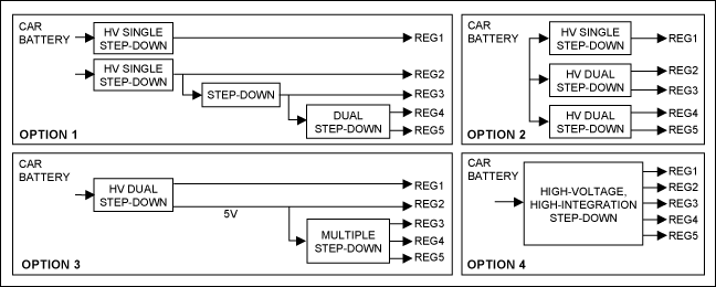 以下列出了四種常用的電源架構,總結了最近三年汽車領域的典型設計架構。當然,用戶可以通過不同方式實現具體的設計要求,多數方案可歸納為這四種結構中的一種。