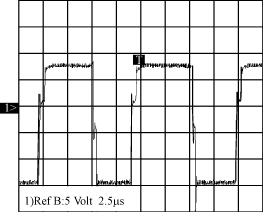 開關(guān)管S1和S的Uds波形如圖3所示,RefA為S管壓降波形,50V/div,RefB為S1管壓降波形,50V/div。電路此時工作在Vin=60V左右,S1和S的開關(guān)應(yīng)力大概為120V,D=0.5左右。圖4為變壓器輸出電壓,也就是同步整流管SR1和SR的驅(qū)動信號,正的部分為SR的驅(qū)動信號,負的部分為SR1的驅(qū)動信號。實驗所得波形和分析的波形基本吻合,只是在開關(guān)轉(zhuǎn)換瞬間,電壓有小尖峰,這是由電路的雜散參數(shù)引起的。該電路的工作效率經(jīng)過測量大約在90%左右,基本達到設(shè)計的要求。