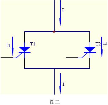 由于單個元件耐壓水平的提高,每個元件并聯(lián)工作以增大設(shè)備功率的情形更常見,以兩只晶閘管并聯(lián)工作為例,如圖二所示。