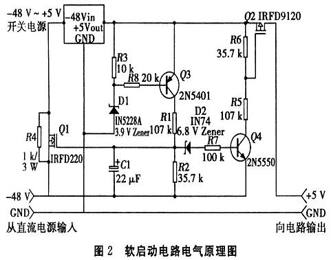 下面采用一個(gè)從-48V~+5V的開關(guān)電源路論述“軟啟動(dòng)”技術(shù)。所用的開關(guān)電源是一個(gè)含有LT1172HVCT的穩(wěn)壓器,從負(fù)到正補(bǔ)償提升式(buck-boost)轉(zhuǎn)換器,其實(shí)任何一個(gè)從-48V~+5V的開關(guān)電源都能工作。其中,軟啟動(dòng)電路和開關(guān)電源電路是相互獨(dú)立的,電氣原理如圖2所示。