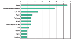 據2007年在美國舉辦的APEC(應用功率電子會議)會議給出的有關數據指出,全球電源市場按品牌劃分如圖1所示(資料來源:2007APEC會議IMS調研機構給出的有關數據(2005年全球電源市場按品牌所占的市場份額%劃分))。
