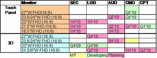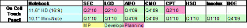 隨著Windows 7推出與對(duì)未來市場(chǎng)影響力,2010年多數(shù)面板廠商針對(duì)Notebook PC市場(chǎng)積極開發(fā)具觸控功能11.6寸寬螢?zāi)幻姘澹瑫r(shí)每一家生產(chǎn)迷你筆電面板廠商也都開發(fā)具有觸控功能面板。從下表一可以清楚了解每一廠商開發(fā)具觸控功能Notebook PC或迷你筆電面板時(shí)間表。