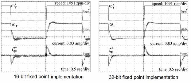 比例積分控制器的積分項(xiàng)總是采用 32 位字長(zhǎng)甚至是 16 位定點(diǎn)版本,根據(jù)以往的經(jīng)驗(yàn),采用 16 位積分累加的結(jié)果明顯地差的多。采用類似仿真的策略將 ±0.5 pu 的步長(zhǎng)應(yīng)用于系統(tǒng)速度參考。d 軸及 q 軸電流和估測(cè)速度作為速度命令的步長(zhǎng),這些也證實(shí)了仿真結(jié)果。在瞬態(tài)及穩(wěn)態(tài)狀態(tài)下,仿真結(jié)果的響應(yīng)相關(guān)性很強(qiáng)。不良振蕩瞬態(tài)及因采用 16 位實(shí)施造成的瞬態(tài)時(shí)間增加等情況下的量化效應(yīng)是可以驗(yàn)證的。
