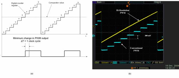 圖 3. 標(biāo)準(zhǔn) PWM 方案圖,以及高分辨率PWM 與傳統(tǒng)PWM 的示波器圖比較