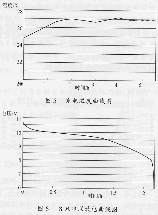 為進一步說明,特提供一組用我們設計的充電器,對市場上某品牌鎳氫電池(Ni-HM)5號1300mA•h,8只串聯充放電結果的打印曲線(環境溫度為25℃)如圖3~圖6所示。從這一組電池的充電電流接受曲線、充電電壓上升曲線、電池溫度變化曲線、0.5C恒流放電曲線可以看到,整個充電過程,電池溫升很小,不超過3~4℃,充滿電的時間,從標準的14~15h,縮短為3~4.5h。由于整個充電過程電池溫升很小,所以,不需要進行任何的人為干預。信息請登陸:輸配電設備網