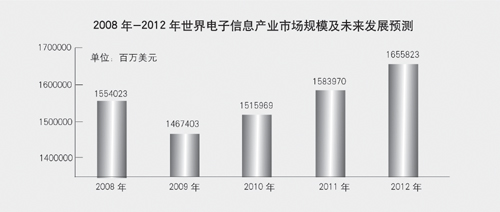 2010年,全球電子信息產業將逐步回暖并步入全面復蘇階段。根據《世界電子數據年鑒》預測,未來3年,全球電子信息產業市場規模將維持3%-4%的增幅,預計2010年市場規模將達到15159.7億美元,2012年將達到16558.2億美元。同時,未來3年信息技術應用將進一步深化,信息技術的廣泛滲透和深度應用將催生出一批新的增長點;綠色IT將成為未來發展重點,綠色信息技術在節能減排、低碳經濟中將發揮重要作用;企業并購重組步伐加快,新興市場拓展將成為電子信息產業發展的另一個重要引擎。