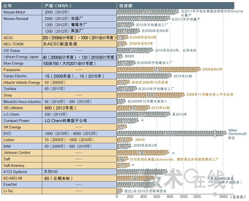 三洋電機(SanyoElectric)已經預留將在2015年前投入此領域的800億日元,而松下公司(Panasonic)在2012年前的預算是1,230億日元。日本鋰離子充電電池的三大廠總共將投入3,000億日元。