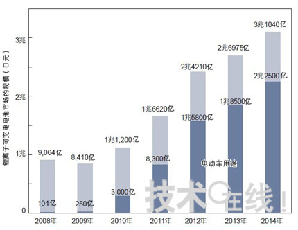 電動汽車鋰離子充電電池的市場在2014年預期會超過兩萬億日元,而整體的電池市場將超過3萬億日元。圖表是NikkeiElectronics依FujiKeizai提供的資料制成。 相反的,EV市場只有250億日元,但它將在2010年爆發成長至3,000億日元,并在2012年超越可攜式設備市場,達到驚人的1萬億5,800億日元。預估它在2014年會持續成長至2萬億2500億日元,代表只不過5年的時間,會有90倍的成長。