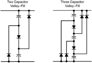 業界有關無源(Passive)功率因數校正(PFC)的方案眾多,這些方案通常都使用較多的額外元器件,其中的一種方案就是谷底填谷(valley-fill)整流器,其中采用的電解電容和二極管組合增大了線路頻率導通角,從而改善功率因數。實際上,這個過程利用高線路電壓以低電流給串聯電容充電,然后在較低電壓時以較大電流讓電容放電給開關穩壓器。典型應用使用2個電容和3個二極管,而要進一步增強功率因數性能,則使用3顆電容和6個二極管。
