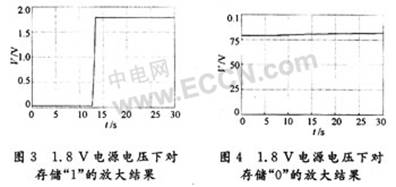 圖4為靈敏放大器在1.8V電源電壓在室溫條件下對存儲信息“0”放大的仿真圖形。從仿真結(jié)果可以看出,輸出電壓有微小的變化,但是在整個過程中輸出電壓都低于0.1V,都在低電平范圍內(nèi)。這說明該電流靈敏放大器在室溫情況下能對存儲信息“0”進行可靠讀取。