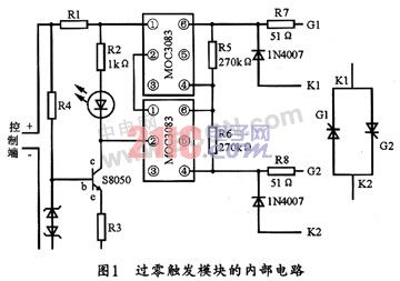 由于切除的電容器上一般都有剩余電壓,而電容器兩端的電壓不能突變,因此,當系統電壓和電容器殘壓的差值較大時,觸發晶閘管會產生很大的沖擊電流,而可能直接損壞晶閘管。為了實現動態無功補償裝置快速響應,同時又保證投切無沖擊電流,因此需要檢測電容器電壓和電網電壓。只有當兩者大小相等、極性相同時,才能瞬時投入電容。因此需要加裝過零觸發模塊。目前,從晶閘管兩端取得過零信號的典型觸發電路是MOC3083。MOC3083芯片內部有過零觸發判斷電路,它是為220V電網電壓設計的專門芯片,其芯片的雙向可控硅耐壓為800V。在4、6兩端電壓低于12V時,如果輸入觸發電流,其內部的雙向可控硅導通。圖1所示是用在380V電網的TSC電路上串聯兩只MOC3083的過零觸發模塊的內部電路圖。