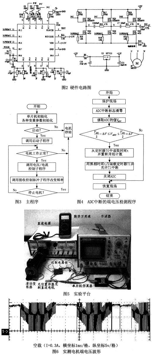 無刷直流電機的無位置傳感器控制的難點在于轉子位置信號的檢測,目前國內外研究人員提出了諸多方法,其中反電動勢法最為簡單、可靠,應用范圍最廣泛。普遍采用的控制方案為基于DSP的控制和基于專用集成電路的控制等,但是其價格高、體積大,不利于用在微型電機控制器中。本文介紹基于C8051F330單片機、檢測反電動勢法的無位置傳感器無刷直流電機的控制器,系統結構簡單,體積超小型,價格低廉,運行性能良好。