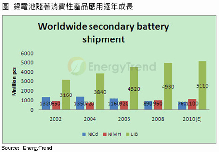 Energy Trend 表示,在消費性產品領域的二次電池領域中,鎳鎘電池的歷史最為悠久,但是因為在材料環保方面,受到質疑,包括歐洲地區在內的一些先進國家,限制鎳鎘電池僅能在醫療以及軍事等特殊用途使用。至于鎳氫電池的使用上,過去普遍使用在數字相機等消費性產品上面,但是隨著產品訴求逐漸朝向輕薄發展,使得鎳氫電池的市占率逐漸縮小。