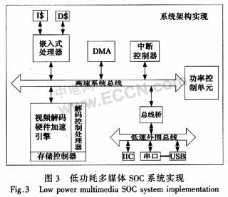 目前,在多媒體SOC設(shè)計(jì)過(guò)程中,針對(duì)其重要的視頻應(yīng)用的負(fù)載特性進(jìn)行功耗優(yōu)化是一個(gè)非常熱點(diǎn)的研究問(wèn)題。常見(jiàn)的低功耗設(shè)計(jì)技巧主要有動(dòng)態(tài)電壓調(diào)整(dynamicvoltagescale,DVS)和動(dòng)態(tài)功率管理(dynamicpowermanagement,DPM)技術(shù)。在DVS技術(shù)中,在保證服務(wù)質(zhì)量的同時(shí),讓不同計(jì)算量的任務(wù)運(yùn)行在不同的工作電壓和頻率;而DPM技術(shù)則在運(yùn)行過(guò)程中,動(dòng)態(tài)關(guān)閉系統(tǒng)某些空閑模塊。在眾多針對(duì)多媒體應(yīng)用進(jìn)行低功耗設(shè)計(jì)的研究中,其主要思路可分為兩類(lèi)。一種是將多媒體應(yīng)用的負(fù)載當(dāng)作一個(gè)隨機(jī)過(guò)程,然后采用馬爾可夫或者半馬爾可夫模型預(yù)測(cè)負(fù)載,再根據(jù)預(yù)測(cè)結(jié)果調(diào)整當(dāng)前系統(tǒng)運(yùn)行狀態(tài)。如在文中,提出了一種基于回歸方程的方式,通過(guò)系統(tǒng)當(dāng)前“工作”和“空閑”時(shí)間預(yù)測(cè)即將到來(lái)的“工作”和“空閑”時(shí)間。分別利用離散馬爾可夫時(shí)間序列和連續(xù)馬爾可夫序列算法預(yù)測(cè)系統(tǒng)負(fù)載。以上這些方式都有效地降低了系統(tǒng)功耗開(kāi)銷(xiāo),但是其最大不足之處在于多媒體應(yīng)用的編碼方式和內(nèi)容多種多樣,無(wú)法找到一種合適的模型來(lái)適應(yīng)所有多媒體應(yīng)用。另外一方面,也有研究利用實(shí)時(shí)反饋控制的方式,來(lái)調(diào)整當(dāng)前系統(tǒng)運(yùn)行狀態(tài)的方式來(lái)降低多媒體系統(tǒng)的功耗。