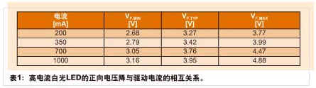 為了確保最佳的性能和長久的工作壽命,LED需要一個有效的驅動電路。這些特殊的驅動電路必須能夠從一根相當苛刻的汽車電源總線獲取工作電源,而且還應兼具成本和空間“效益性”。為了維持其長久的工作壽命,一定不得超過LED的電流和溫度限值。表1羅列了針對一個高電流白光LED的典型正向電壓與驅動電流的相互關系。
