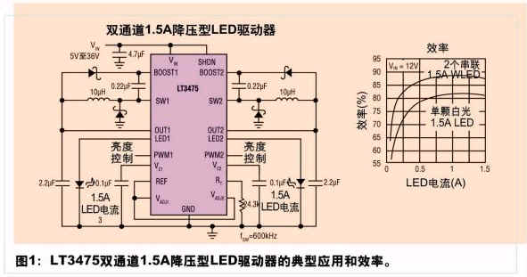許多嵌入式高電流LED應用將包括單個或兩個高電流(ILED的范圍從1A至1.5A)LED。這些應用包括車內照明(比如:車頂燈、地圖燈、儲物盒照明燈)和車外照明(比如:車門門檻燈或“地面照明”燈)。根據應用的不同,它們可以采用彩色LED(用于車載儀器的背面照明)或白光LED(用于普通照明)。由于這些LED通常具有一個3V至4V的正向電壓,并由一根12V至14V的汽車總線來供電,因此需要采用一個降壓型轉換器(例如:LT3475)。
