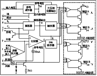 SG3525是美國通用公司的產品,如圖2所示,內部電路主要由基準電源、振蕩器、誤差放大器、PWM比較器與鎖存器、分相器、欠電壓鎖定、輸出級、軟啟動以及關斷電路等組成。基準電源是一個典型的三端穩壓器,精度可達,采用了溫度補償。作為內部電路的供電電源,并可向外輸出40mA電流。振蕩器由一個雙門限比較器,一個恒流源及電容充放電電路組成,在芯片外部由5腳對地接一電容器,6腳對地接一電阻,5腳和7腳之間外接電阻即可構成該振蕩器。