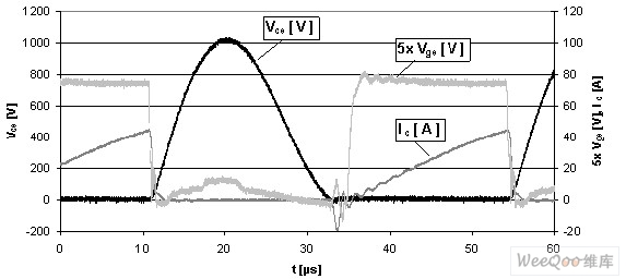 圖11:1.8kW電磁爐應用(IHW20N120R2)的電壓諧振電路波形