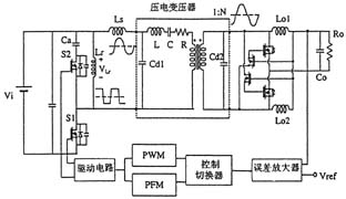 日本的研究人員開發(fā)成功一種振動型壓電變壓器,其厚度僅為4mm。該壓電變壓器的驅(qū)動電路采用方波逆變器,通過改變其開關(guān)頻率(PFM方式)以達到借助壓電變壓器的諧振特性來調(diào)整輸出電壓的目的。但是,由于壓電變壓器具有多種由其形狀所決定的諧振頻率,所以很難通過大幅度地改變頻率的做法來控制輸出電壓。為此,人們正在研究引入逆變器的脈寬調(diào)制(PWM)技術(shù)。圖7示出了通過將驅(qū)動用逆變器、采用電流倍增器的整流電路以及采用PFM和PWM方式的混合控制電路與壓電變壓器相連而構(gòu)成的壓電變壓器DC/DC轉(zhuǎn)換器。
