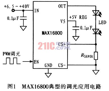 圖1為MAXl6800典型的調(diào)光應(yīng)用電路。MAXl6800具有高輸入電壓范圍(達(dá)40V),可直接連接到汽車(chē)電池而不需要保護(hù)器件,保護(hù)器件一般用來(lái)抵御電池負(fù)載變化帶來(lái)的浪涌電壓。MAxl6800能夠?yàn)長(zhǎng)ED提供恒定電流,電流值可以通過(guò)與LED串聯(lián)的檢流電阻RSENSE設(shè)置。為了提高電流設(shè)置精度,提高對(duì)外部噪聲的抑制能力,MAXl6800采用差分電流檢測(cè)輸入方式。