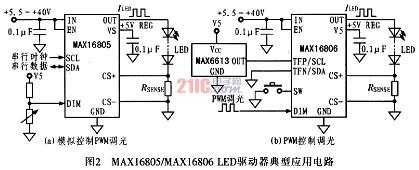 由于很多照明系統(tǒng)沒(méi)有可利用的微控制器產(chǎn)生PWM調(diào)光信號(hào),因此可采用MAXl6805/MAXl6806型LED驅(qū)動(dòng)器。這兩款器件均由內(nèi)部產(chǎn)生PWM信號(hào),PWM信號(hào)由加在DIM輸入引腳的外部模擬電壓設(shè)置。不采用模擬調(diào)光時(shí),MAXl6806有一個(gè)開(kāi)關(guān)輸入(SW),該開(kāi)關(guān)輸入不僅檢測(cè)開(kāi)關(guān)狀態(tài),并具有去抖功能,為開(kāi)關(guān)提供濕電流。圖2為MAXl6805/MAXl6806典型應(yīng)用電路。