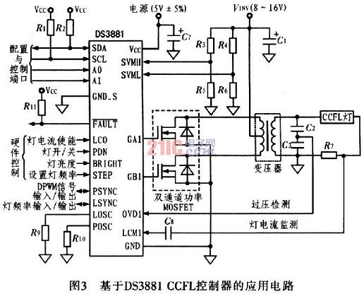 由于基本的CCFL電路中包含有外部晶體管、變壓器和燈管,CCFL架構(gòu)存在EMI輻射源。圖3給出利用DS388lCCFL控制器構(gòu)建的CCFL燈管電源電路,該設(shè)計(jì)優(yōu)化于汽車(chē)應(yīng)用環(huán)境。DS388l利用擴(kuò)展頻譜和頻率偏移技術(shù)大大降低了EMI輻射,并把噪聲頻譜搬移到系統(tǒng)不敏感的頻段,從而克服了EMI輻射。