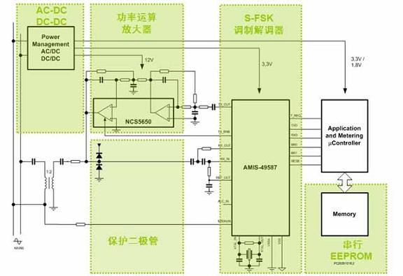 此外,AMIS-49587采用S-FSK調(diào)制技術(shù),結(jié)合高分辨率的濾波算法,配以自動(dòng)可信值/中繼器(repeater)功能,提供基于長(zhǎng)距離電力線(xiàn)的高可靠性數(shù)據(jù)通信。通信誤差比其它可選及現(xiàn)有方案更低。這器件藉板載低抖動(dòng)鎖相環(huán)(PLL)與交流主電源(mains)信號(hào)同步。由于包含16位分辨率的模擬前端,使器件具有極優(yōu)的噪聲免疫性和極高的接收靈敏度。