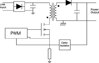 開關電源電路有許多種,但最常見的是反激式轉換器,其原理如圖1所示,電源輸入首先經過整流,然后濾波,接下來經過變壓器和初級開關,以及初級控制器;這個控制器根據反饋信號來改變開關的占空比,反饋信號是由次級反饋而來。