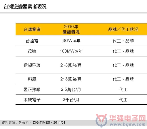 DIGITIMES Research指出,目前臺廠逆變器均獲得多數國家并網認證,產品品質有相當水準。然而,太陽能逆變器的缺貨狀況在2010年第3季告一段落,因此,2010年第4季兩岸業者的出貨量明顯下滑。當全球知名太陽能逆變器業者于2010年以2、3倍甚至更高的速度擴充產能,加上上游零組件缺料疑慮解除,太陽能逆變器供給缺口得以補足時,兩岸業者能否持續獲得訂單,成為市場一大疑慮。