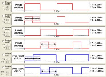 因此,為最大限度地提高效率,要求死區(qū)時間盡可能小。但是在傳統(tǒng)的模擬方案中,自驅(qū)動型除了應(yīng)用的限制外,還很難提供精確的控制時序;對于外驅(qū)動型,由于其參數(shù)是由電阻、電容等無源器件進行設(shè)定,存在誤差、老化、溫漂等問題,為保證有足夠的余量,死區(qū)時間也不可能設(shè)置得很小。因此,ADP1043的數(shù)字方案是很好的選擇。圖2所示為ADP1043在全橋拓撲電路下的PWM和SR的GUI設(shè)置界面。通過設(shè)置T9、T10、T11和T125便可精確獲得同步整流MOSFET所需的死區(qū)時間,其中每次調(diào)整的最小時間為5ns。