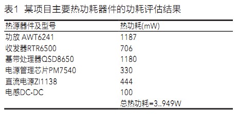 終端平臺(tái)的熱源器件主要有基帶芯片、射頻芯片、功放、電源管理芯片等,這些器件的功耗有的可以從廠商給的datasheet中查到,有的查不到,對(duì)于從datasheet中查不到功耗數(shù)據(jù)的熱源器件,需要根據(jù)經(jīng)驗(yàn)或同類項(xiàng)目的測(cè)試數(shù)據(jù)進(jìn)行估算,還可以直接向平臺(tái)提供商索取相關(guān)數(shù)據(jù)。表1為某項(xiàng)目主要熱功耗器件的功耗評(píng)估結(jié)果。