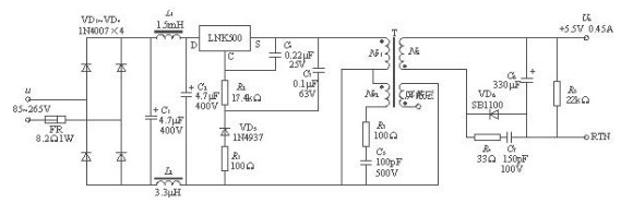 1)采用高效率恒壓/恒流式單片開關電源LNK500,交流輸入電壓范圍是85~265V,當交流輸入電壓為265V時,漏電流<5μA,額定輸出電壓為5.5V,最大輸出電流為0.45A,輸出功率為2.5W。