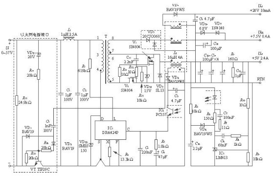 1)采用DPA424P型單片開關式穩壓器,構成正激、隔離式、3路輸出的DC/DC電源變換器模塊。直流輸入電壓范圍是36~75V,3路輸出分別為5V/2.4A、7.5V/0.4A和20V/10mA,總輸出功率為15.2W,開關頻率為400kHz;