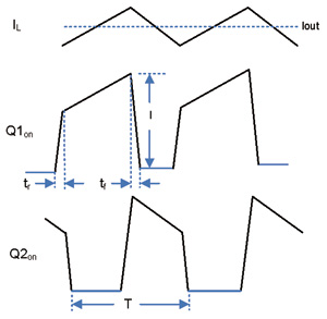 在頻域內測量輻射和傳導電磁干擾,這就是對已知波形做傅里葉級數展開,本文中我們著重考慮輻射電磁干擾性能。在同步降壓轉換器中,引起電磁干擾的主要開關波形是由Q1和Q2產生的,也就是每個場效應管在其各自導通周期內從漏極到源極的電流di/dt。圖2所示的電流波形(Q1on和Q2on)不是很規(guī)則的梯形,但是我們的操作自由度也就更大,因為導體電流的過渡相對較慢,所以可以應用HenryOtt經典著作《電子系統(tǒng)中的噪聲降低技術》中的公式1。我們發(fā)現(xiàn),對于一個類似的波形,其上升和下降時間會直接影響諧波振幅或傅里葉系數(In)。