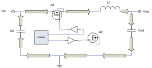當Q1關斷、Q2導通時,就形成了第二個回路。之后存儲在L1內的能量流經輸出電容器和Q2,如圖5所示。這些回路面積控制對于降低電磁干擾是很重要的,在PCB走線布線時就要預先考慮清器件的布局問題。當然,回路面積能做到多小也是有實際限制的。