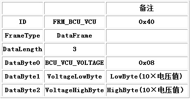 表1BCU_VCU_VOLTAGE(0x08)向VCU送回電池組當(dāng)前的電壓