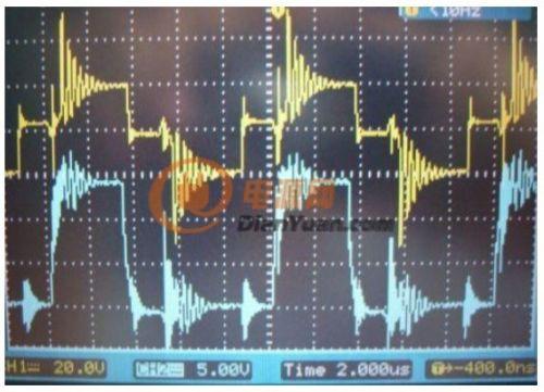 此圖為實測逆變器滿載時的推挽A相與B相MOS管的G極波形(1:10),由于采用了+15V開通、-5V關(guān)斷的驅(qū)動方式,同時精選低Qgs的功率MOS管,驅(qū)動波形的“尖峰”干擾大為減少,也可看到由于采用了負壓關(guān)斷,滿載時從對方相位串?dāng)_過來的“毛刺”被有效控制在0V線以內(nèi)(紅圈),確保截止時期的MOS管能絕對可靠地截止關(guān)斷。
