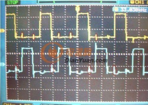 在談驅(qū)動問題前,先上一幅實測的推挽逆變電路的其中一邊MOS管的G極波形(1:1藍)與升壓變壓器的副邊電壓波(15:1黃),這是電路處在滿載1000WDC+24V輸入時的實測波形,可以看到另一路MOS管導(dǎo)通時串入到截止MOS管的G極的干擾尖刺波形。