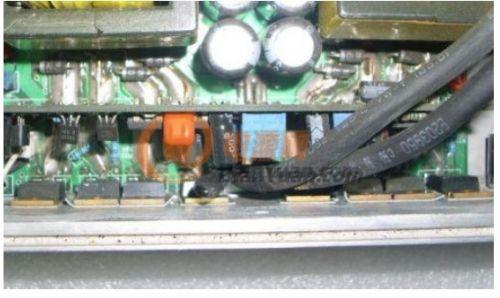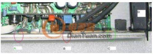 攝氏25度環(huán)境時,輸出滿載1000W,10分鐘后圖片B處(8個MOS管的中心位置)的溫度比A處高出6~8度!C處(綠圈)最低,比B處低14~15度!(C處為進風(fēng)口,D為風(fēng)扇,樣機為進風(fēng)設(shè)計,據(jù)說是用以延長含油軸承的壽命),同樣型號并聯(lián)工作的功率MOS管,實際工作的溫差那么大,自然對“均流”是極其不利!所以可靠性不高就不足為怪了。