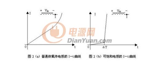 普通鐵氧體電感和可飽和電感在直流電壓Vdc作用下的電流強度I隨時間t變化的曲線如圖2(a)和圖2(b)所示。