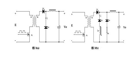 在圖3(a)所示的正激電源電路中,當初級功率管V1開始導通,次級整流二極管D1開始導通,D2開始截止時,由于二極管PN結的電荷存儲效應,D2中流過了電流變化率di/dt很大的反向恢復尖峰電流i,致使V1、D1中也有相應的尖峰電流流過,在漏感、線電感等因素的共同作用下會在電源輸出端產生高頻的導通噪聲。在D2上施加的反向電壓越大,D2的反向恢復時間越長,反向恢復電流變化率di/dt就越大,電源輸出噪聲也就越大。大的反向恢復尖峰電流,不僅會產生電源噪聲,也容易損壞整流器件。