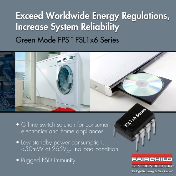 飛兆半導體公司 (Fairchild Semiconductor)近期開發(fā)出FSL1x6 系列綠色模式飛兆功率開關(guān) (FPS)器件,這些集成式PWM控制器帶有專有的綠色模式功能,提供了先進的間歇模式控制,并在間歇模式下關(guān)閉部分功能模塊減小控制器自身操作電流,從而最大限度地降低待機功耗。