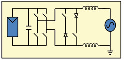 無變壓器的DC/AC逆變器在歐洲廣泛應(yīng)用,但是在美國,這種產(chǎn)品只是最近才在某些地區(qū)被使用。無變壓器的逆變器拓?fù)浣Y(jié)構(gòu)有很多種,而Fraunhofer研究所開發(fā)的HERIC拓?fù)浔憩F(xiàn)出了很高的效率。傳統(tǒng)的全橋逆變器的結(jié)構(gòu)如圖1所示,HERIC拓?fù)淙鐖D2所示,此圖中還顯示了兩種新的開關(guān)/二極管對。這種拓?fù)淅锚?dú)有的續(xù)流路徑來減小開關(guān)和導(dǎo)通損耗,使效率提升到98%以上。