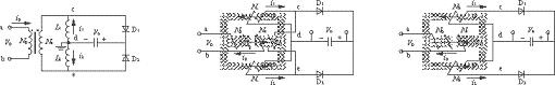 (a)分立磁性元件的倍流整流(b)PengC提出的IM-CDR[1](c)ChenWei提出的IM-CDR[2]