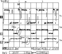 IM-CDR結構選擇如圖1(c)所示的拓撲。從結構上可以看出,磁芯的3個磁柱上都加了相同的氣隙(lg),這必然會導致變壓器原邊的漏感(Lk)的增大,但可以利用變壓器原邊漏感中的能量實現副邊同步整流管的自驅動(開通),同步管的關斷是通過外加驅動信號來完成的。實驗電路如圖2所示,由圖2可以看到副邊同步管的驅動電路包括一個繞組(Na),兩個二極管(Da1,Da2)和兩個MOS管(Sa1,Sa2),它的實現比較簡單,只需要在磁芯的中心磁柱上多加一組繞組即可。變壓器原邊采用的是對稱半橋拓撲。實驗電路的具體參數見表1所列。實驗波形圖如圖3和圖4所示。圖3是在負載電流Io=4A時測得的變壓器原邊電壓波形以及兩個同步整流管的門極驅動電壓波形圖。由于此時的負載電流較小,反映到變壓器原邊的激磁電流也較小,在原邊開關管關斷的瞬間,變壓器原邊漏感(Lk)與開關管輸出結電容(Co1,Co2)間的振蕩尖峰不夠高,不足以開通副邊的同步整流管。